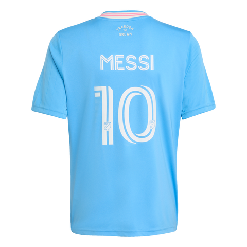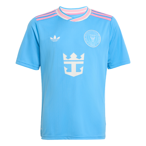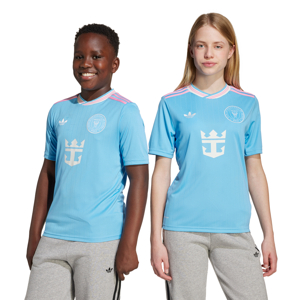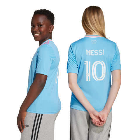 The vibrant spirit of Miami and the beauty of its world-famous coastline meet in this juniors' Inter Miami CF jersey. Broken only by waves of subtle pinstripes and pops of pink, the ocean-blue colours of this third shirt bring a calming elegance. A club badge, adidas Trefoil and Lionel Messi's name and number add extra appeal. Moisture-managing AEROREADY ensures it feels pretty special too.