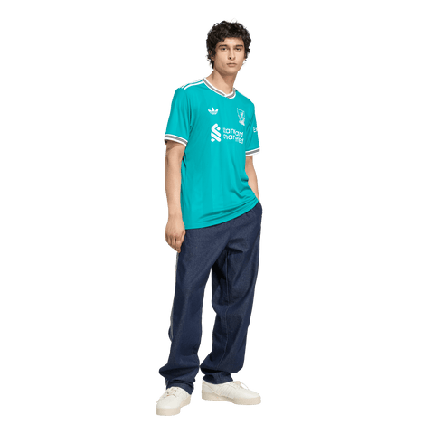 A modern football classic inspired by Liverpool FC's storied 3-Stripes history. The tonal vertical stripes on this elegant third jersey come in unmistakable adidas Equipment green. On the chest, that vintage club badge shares the spotlight with a Trefoil for the first time since 1991. Created for travelling Reds, this shirt includes moisture-managing AEROREADY so it feels as good as it looks.