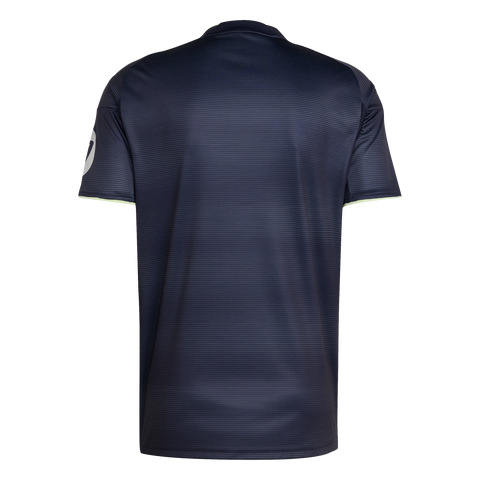 As Real Madrid's world-famous stadium enters a brand-new era, this adidas away football jersey pays tribute to magical nights at the Santiago Bernabéu. Its moiré effect print and silver metallic details combine to mimic the gleaming facade of the renovated arena. Moisture-managing AEROREADY ensures fans feel home comforts when they're on the road with their team.